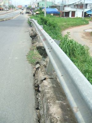 Taluy cầu An Lạc thuộc quốc lộ 1A, phía P.An Lạc, Q.Bình Tân đã bị sạt lở, bong ra tạo kẽ hở rộng và dài hơn 5m. Nguy hiểm hơn, mảng bê tông lớn chực chờ đổ sụp xuống, kéo theo lan can cầu cũng ngả nghiêng (ảnh). Nếu không sớm được khắc phục, gia cố, “điểm đen” này có thể gây ra tai nạn đáng tiếc.