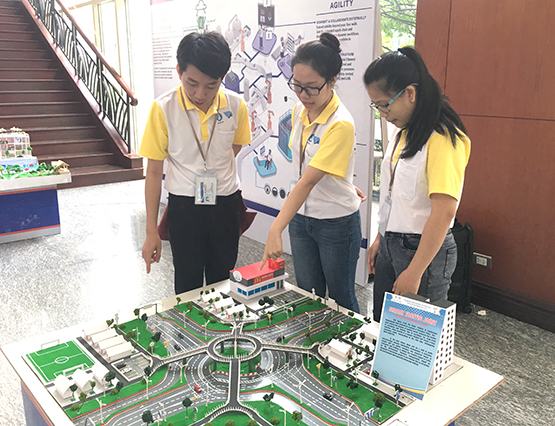 | Sinh viên tham quan mô hình giao thông thành phố thông minh do Trường ĐH Giao thông vận tải TP.HCM thiết kế. Ảnh: N.Anh |