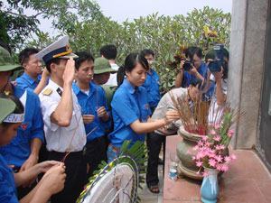 Chiến sĩ hải quân và các bạn sinh viên thắp hương tưởng niệm tại mộ cụ Huỳnh Thúc Kháng (Quảng Ngãi)