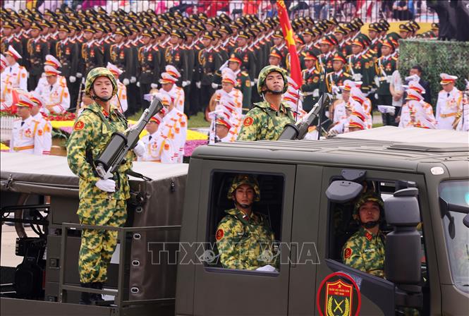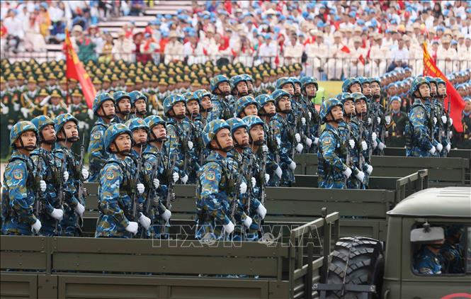 Tiếp theo là khối danh dự 3 quân chủng; khối nữ Quân nhạc; khối sĩ quan Lục quân; khối sĩ quan Hải quân; khối sĩ quan Phòng không – Không quân; khối sĩ quan Biên phòng; khối sĩ quan Cảnh sát biển Việt Nam; khối sĩ quan Hậu cần – Kỹ thuật, Công nghiệp quốc phòng; khối nữ sĩ quan Quân y; khối Học viên các nhà trường Quân đội; khối chiến sĩ Tác chiến điện tử; khối chiến sĩ Đặc nhiệm dù; khối lực lượng Tác chiến không gian mạng; khối nữ Gìn giữ hòa bình Việt Nam; khối chiến sĩ Tăng thiết giáp; khối chiến sĩ Pháo binh – Tên lửa; khối chiến sĩ Đặc công; khối nữ chiến sĩ Biệt động; khối chiến sĩ Công binh; khối nữ chiến sĩ Thông tin; khối chiến sĩ Phòng hóa. Các khối Dân quân, du kích gồm: Khối nam Dân quân tự vệ; khối nữ Dân quân các dân tộc Việt Nam; khối nữ Du kích miền Nam. Các khối diễu binh oai hùng hành tiến biểu tượng cho Quân đội nhân dân Việt Nam cách mạng, chính quy, tinh nhuệ, hiện đại, sẵn sàng chiến đấu, bảo vệ vững chắc độc lập, chủ quyền lãnh thổ của Tổ quốc.