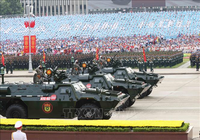 Sau phần diễu binh của các khối đi bộ, các loại vũ khí, khí tài, xe đặc chủng hành tiến nhịp nhàng qua lễ đài cho thấy sức mạnh cơ động, sự hiện đại hóa và khả năng sẵn sàng chiến đấu cao của lực lượng Quân đội nhân dân và Công an nhân dân Việt Nam. Đặc biệt là nhiều loại vũ khí, khí tài như các loại hệ thống tên lửa, UAV, xe chiến đấu do chính Việt Nam nghiên cứu, thiết kế, sản xuất và phát triển. Ngoài ra, nhiều khí tài như tên lửa, xe tăng, xe thiết giáp, pháo phản lực cũng được Việt Nam cải tiến, hiện đại hóa để nâng cao tính năng chiến đấu.