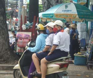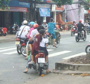 Phụ huynh vẫn còn thờ ơ trong việc đội mũ bảo hiểm cho trẻ. (Ảnh chụp trước cổng trường Tiểu học Nguyễn Sơn Hà, đường Cao Thắng, Q.3 sáng 10-4 )