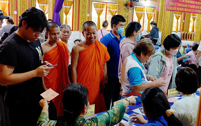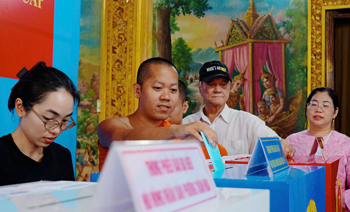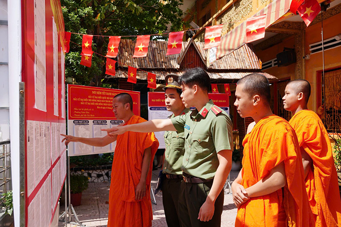 Tại các khu vực chùa Khmer – nơi sinh hoạt văn hóa, tín ngưỡng quen thuộc của đồng bào Khmer, lực lượng chức năng phối hợp với chính quyền địa phương và ban quản trị chùa hướng dẫn cử tri thực hiện đúng quy trình bỏ phiếu. Việc bố trí khu vực bỏ phiếu, lối ra vào và công tác kiểm soát an ninh được thực hiện chặt chẽ và thuận lợi để người dân tham gia bầu cử.