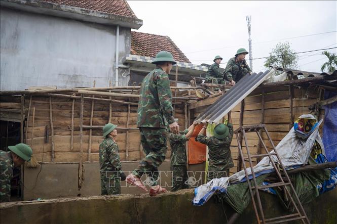 Lực lượng bộ đội ra quân giúp dân xây dựng và sửa chữa nhà cửa bị ảnh hưởng bởi mưa lũ tại xã Lộc An. Ảnh: Mai Trang/TTXVN