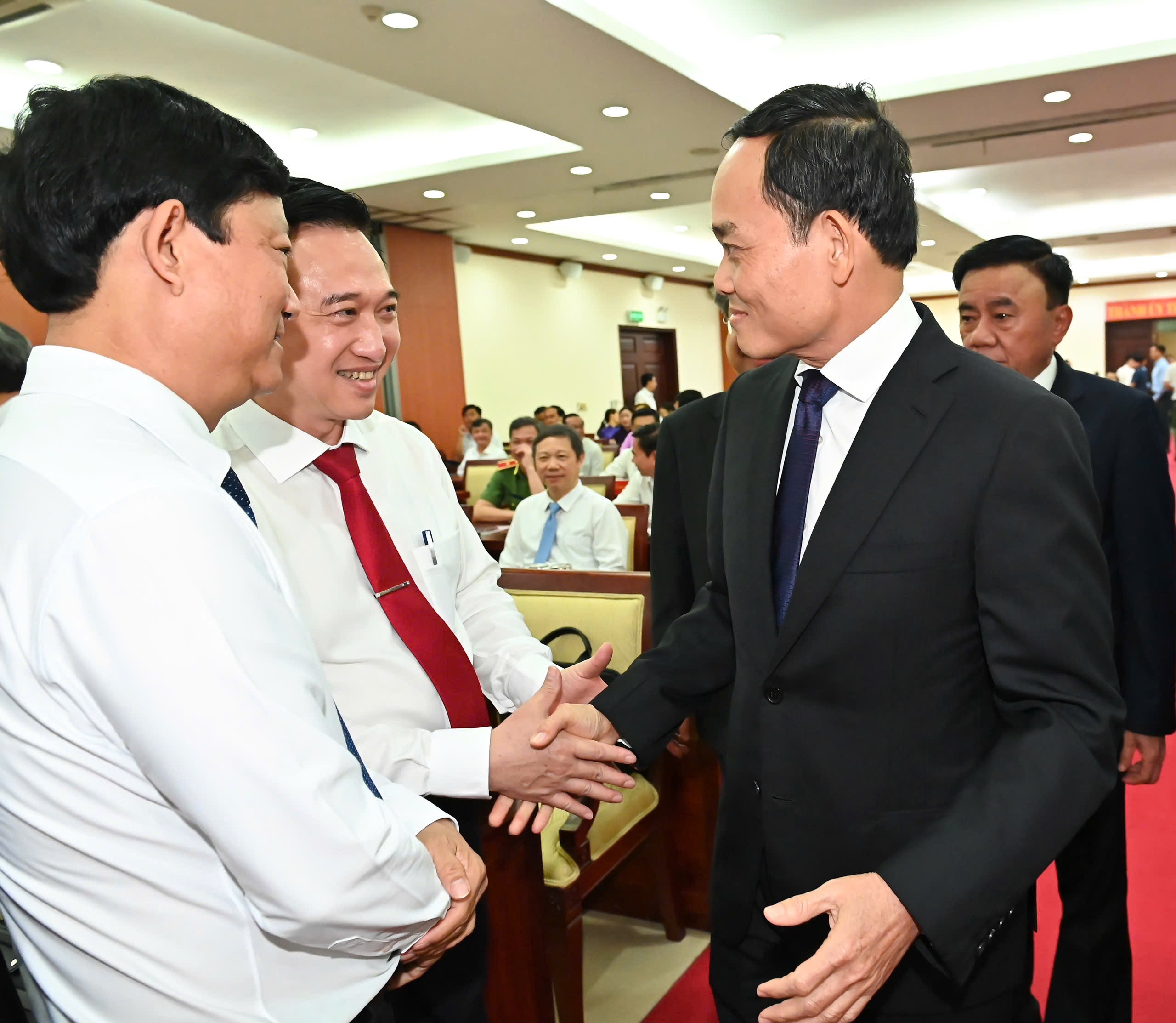 Đồng chí Trần Lưu Quang trao đổi với đồng chí Võ Văn Minh, Phó Bí thư Thành ủy, Chủ tịch HĐND TPHCM và đồng chí Đặng Minh Thông, Phó Bí thư Thành ủy TPHCM. Ảnh: VIỆT DŨNG