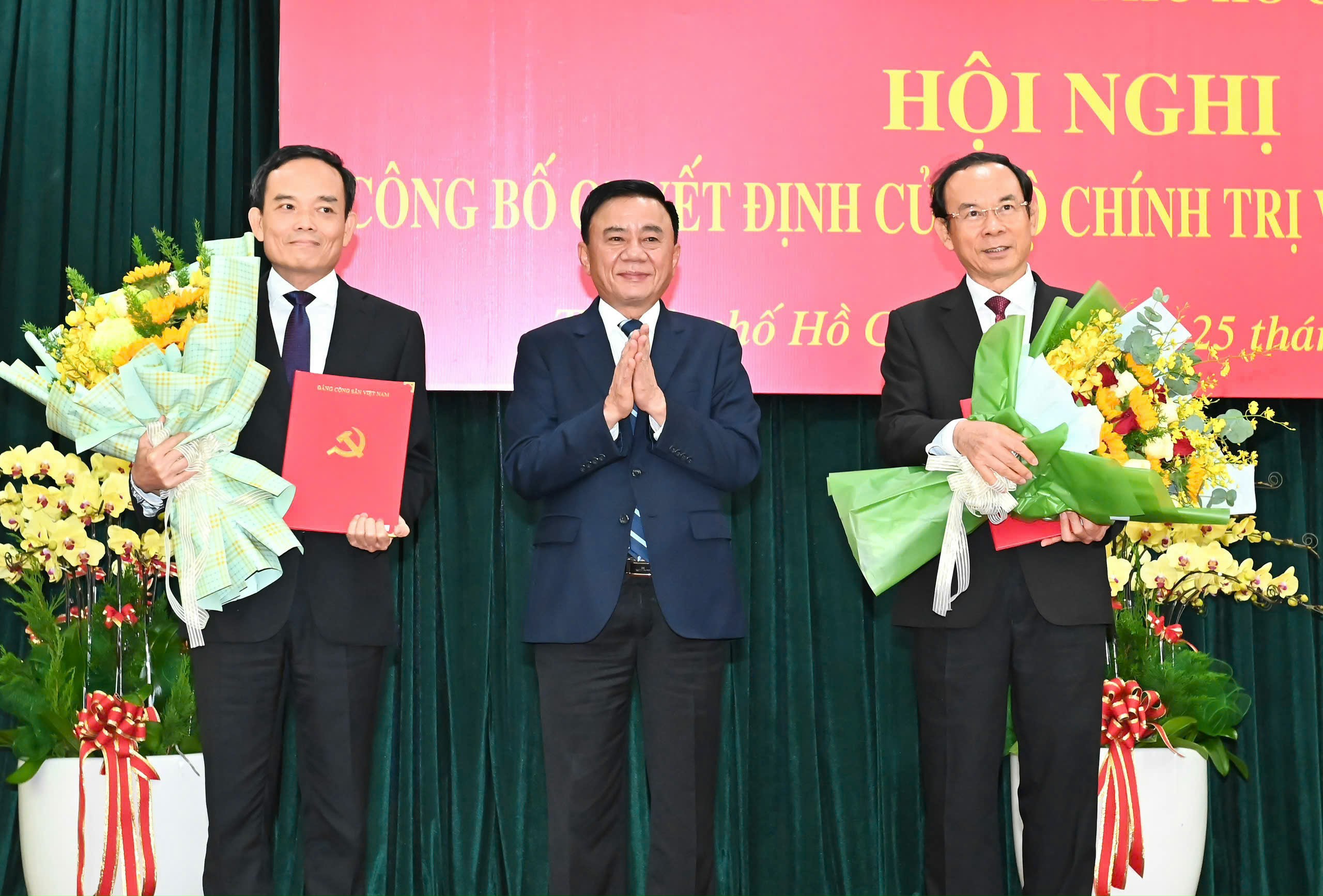 Thường trực Thành uỷ TPHCM tặng hoa chúc mừng đồng chí Nguyễn Văn Nên và đồng chí Trần Lưu Quang. Ảnh: VIỆT DŨNG