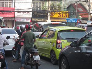Kẹt xe cục bộ tại ngã 3 Hai Bà Trưng – Nguyễn Hữu Cầu do phải tránh cầu tạm cầu Bông (ảnh chụp lúc 7 giờ 30 ngày 1-11)