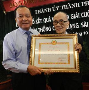 Bí thư Thành ủy Lê Thanh Hải trao bằng khen cho GS.AHLĐ Vũ Khiêu