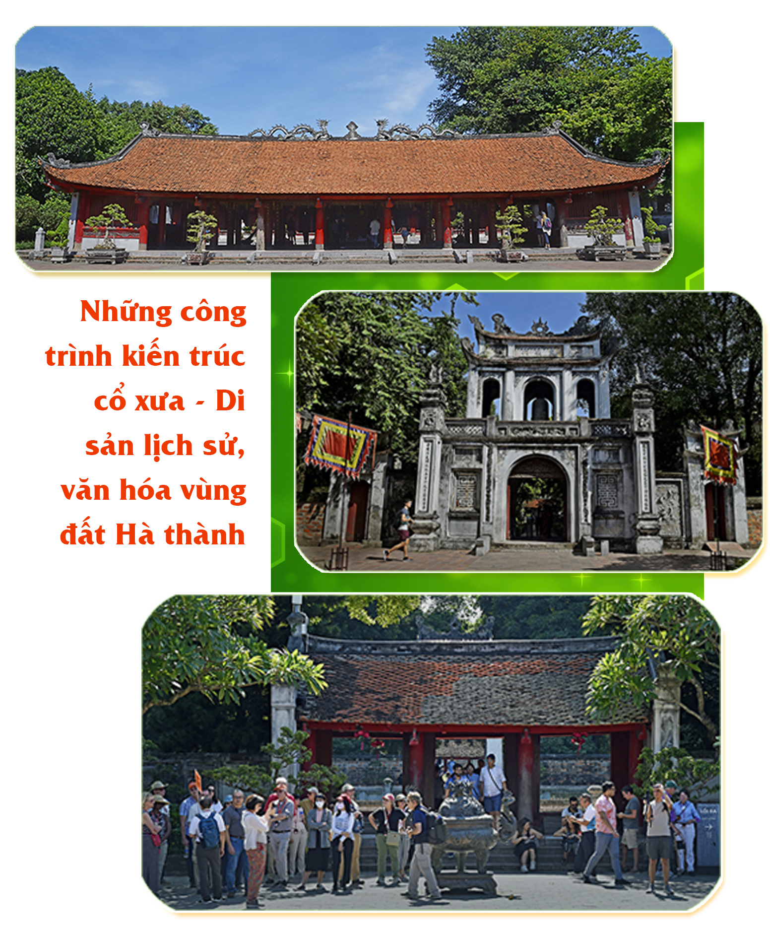 Không chỉ vậy, thủ đô Hà Nội với hàng ngàn năm văn hiến, một thành phố còn hội tụ nhiều di sản văn hóa, lịch sử: Hoàng thành Thăng Long (Di sản văn hóa thế giới); Những công trình kiến trúc cổ được công nhận là di tích quốc gia: Tháp Rùa (Hồ Gươm), đền Ngọc Sơn qua cầu Thê Húc, Văn  Miếu Quốc Tử Giám, chùa Trấn Quốc, chùa Một Cột, Ô quan Trưởng, Cột cờ Hà Nội, đền Quán Thánh, Phố cổ Hà Nội…