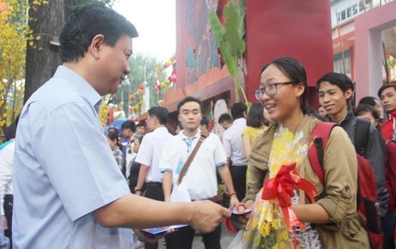 | Bí thư Thành ủy TP.HCM Đinh La Thăng trao vé xe cho sinh viên trước giờ lên xe về quê đón Tết |