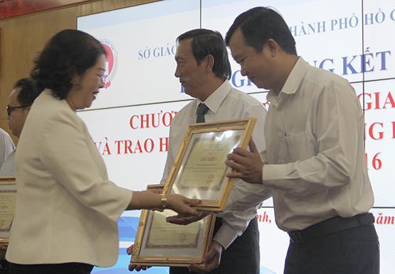 | Bà Bùi Thị Diễm Thu (Phó Giám đốc Sở GD-ĐT TP.HCM) trao giấy khen cho các trường tổ chức tốt hoạt động khuyến học trong chương trình thí điểm |