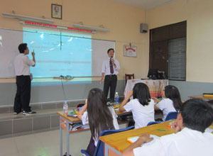 Đưa máy chiếu vào giảng dạy tại Trường THPT Nguyễn Thị Minh Khai, TP.HCM. Ảnh: N.Trinh |