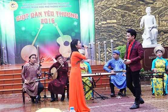 Nhận thức đúng giá trị di sản văn hóa dân tộc, Trường THPT Nguyễn Du cũng đã tổ chức chương trình “Giọt đàn yêu thương”. Chương trình quy tụ nhiều nghệ sĩ tài danh như NSƯT Tấn Giao, chuông vàng vọng cổ Nguyễn Thị Luận, Thanh Toàn, Tuyết Nhung, Thanh Tiền, Hồng Ngọc… Những bài bản, điệu lý, câu hò và các trích đoạn cải lương… mang lại món quà tinh thần vô giá. Trên thực tế, nhiều HS vẫn rất thích nghe cải lương, đờn ca tài tử… và mong muốn có cơ hội được tìm hiểu về nghệ thuật này nhưng giữa môi trường giải trí như hiện nay, các em khó có điều kiện để thưởng thức, tìm hiểu.