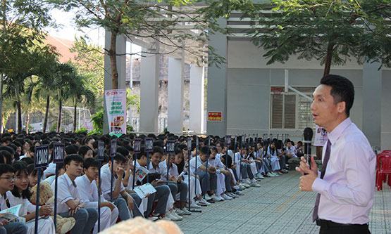 ThS. Trần Hải Nam (Phó Trưởng phòng Tư vấn Tuyển sinh, Trường ĐH Công nghệ TP.HCM) đang tư vấn cho học sinh Trường THPT Võ Văn Kiệt