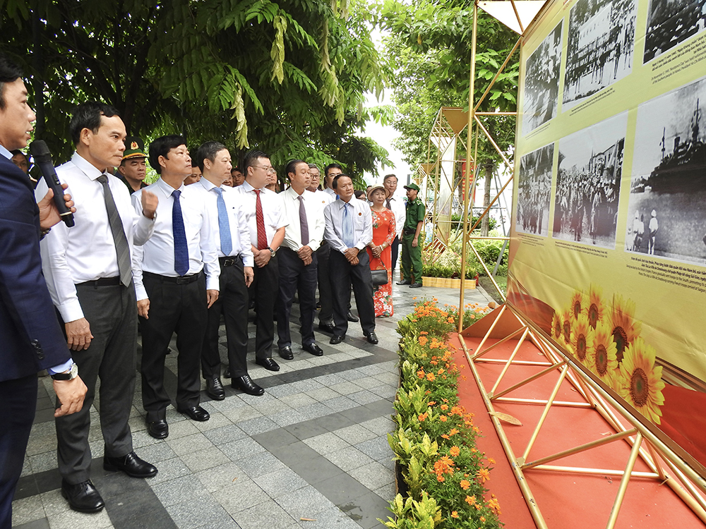 Lãnh đạo Thành phố chăm chú theo dõi những hình ảnh về tinh thần “Nam bộ thành đồng” được trưng bày tại triển lãm