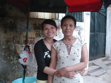 Em Nguyễn Thị Thùy và mẹ bên hàng gạo ở góc vỉa hè. (Ảnh: Hoài Nam).