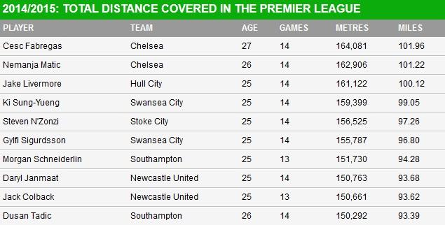 Sau Fabregas, có hai cầu thủ khác cũng chạy vượt mốc 100 dặm, một trong số đó là đồng đội của Fabregas, Matic. Điều đó cho thấy Mourinho sở hữu bộ đôi tiền vệ trung tâm rất cơ động. Nó lý giải vì sao CLB lại thành công cho tới thời điểm này.