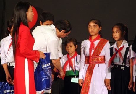 | Ông Tô Huy Rứa – Trưởng ban Tuyên giáo Trung ương trao quà cho cháu Lừ Thị Thanh Xuân (học lớp 4) đang sống tại Trung tâm Bảo trợ xã hội tỉnh Điện Biên. Ảnh: Tiến Dũng. |