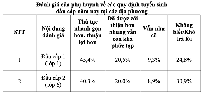 Khảo sát cho thấy 62,7% phụ huynh hoàn toàn hài lòng và 23,8% tạm hài lòng với sự hướng dẫn tuyển sinh của nhà trường, trong khi chỉ có 1,6% không hài lòng. Đáng chú ý, 51,9% phụ huynh không gặp bất kỳ khó khăn nào trong quá trình tuyển sinh, với tỷ lệ đánh giá thủ tục nhanh gọn, thuận lợi hơn đạt 45,4% ở đầu cấp 1, 40,3% ở đầu cấp 2 và 33,3% ở đầu cấp 3.
