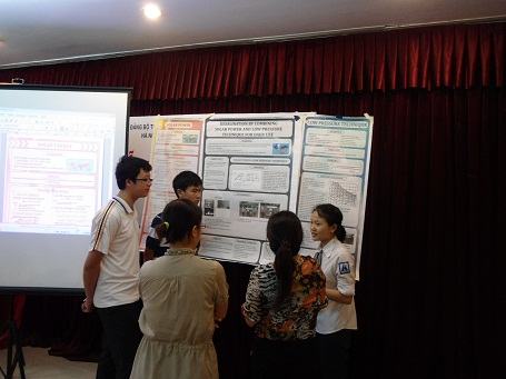 Với vai trò như là Ban giám khảo, các thầy cô đến từ ĐH Khoa học Tư nhiên (ĐH Quốc gia Hà Nội), ĐH Xây dựng… liên tục “chất vấn” nhóm bằng Tiếng Anh nhưng với các em đều tự tin trả lời một cách mạch lạc.