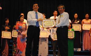 Ông Đỗ Quốc Anh – Vụ trưởng, Giám đốc văn phòng đại diện phía Nam Bộ GD-ĐT trao tặng giấy khen của Sở GD-ĐT TP.HCM cho các tập thể, cá nhân điển hình. Ảnh: Q.Huy |