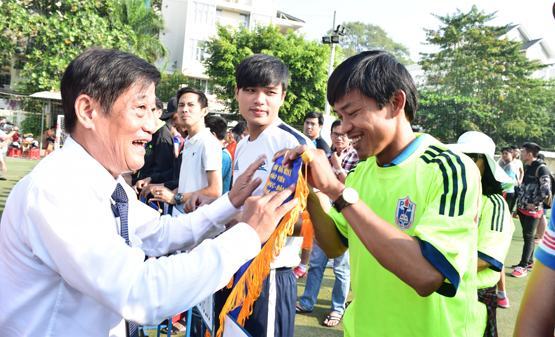 | Ông Nguyễn Tiến Đạt (Phó Giám đốc Sở GD-ĐT TP.HCM) trao cờ lưu niệm cho các đội bóng tham gia giải năm 2016 |