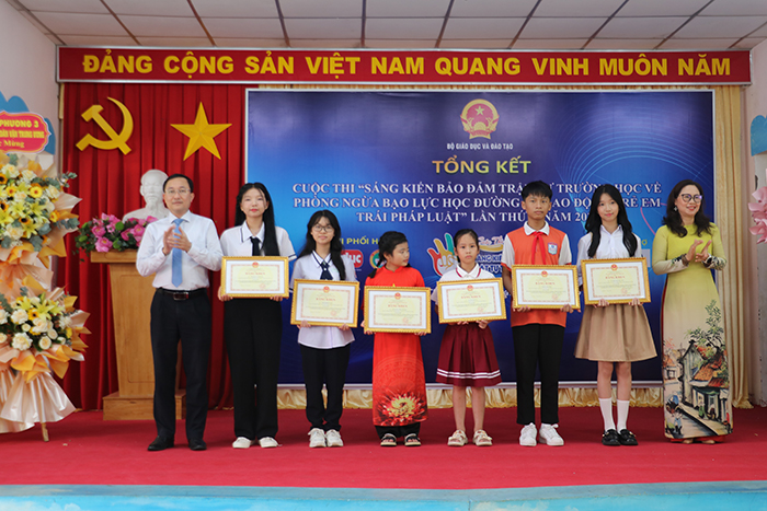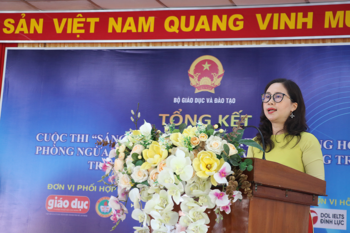 Phát biểu tại buổi lễ, ông Hoàng Đức Minh – Vụ trưởng Vụ Học sinh, sinh viên – Bộ GD-ĐT, Trưởng Ban tổ chức cuộc thi, đề nghị các em HS tham gia cuộc thi cũng như các em đạt giải, hãy là những người tiên phong, là hạt nhân trong công tác phòng ngừa bạo lực học đường và phòng chống lao động trẻ em trái pháp luật. Lan tỏa những sáng kiến của các em đến các bạn HS, cộng đồng và địa phương… Các thầy cô giáo và cơ sở giáo dục cần tăng cường giáo dục pháp luật và phòng chống bạo lực học đường; xây dựng các chuyên đề về kỹ năng sống, kỹ năng tự bảo vệ bản thân; phòng chống xâm hại, bạo lực học đường… thông qua lồng ghép trong các hoạt động giáo dục, hoạt động Đoàn, Đội…; đồng thời phối hợp chặt chẽ với phụ huynh HS trong công tác này; và phát huy vai trò của bộ phận tư vấn tâm lý, trách nhiệm của viên chức tư vấn HS…