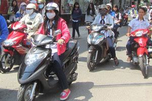 Giờ tan học vào buổi trưa ở Trường THPT Gia Định, TP.HCM, học sinh được cha mẹ đưa đón cũng có, các em đi xe đạp cũng có. Nhưng điều đáng nói là “ở đây có đến 60-70% học sinh lưu thông bằng xe gắn máy”, theo nhận định của một nhân viên bãi giữ xe bên cạnh trường.