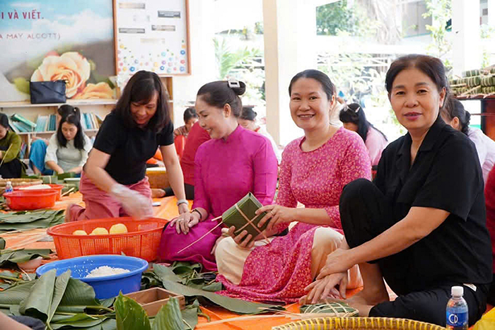 Giáo viên Trường THPT Hùng Vương (Q.5) gói bánh chưng dâng lên các vua Hùng