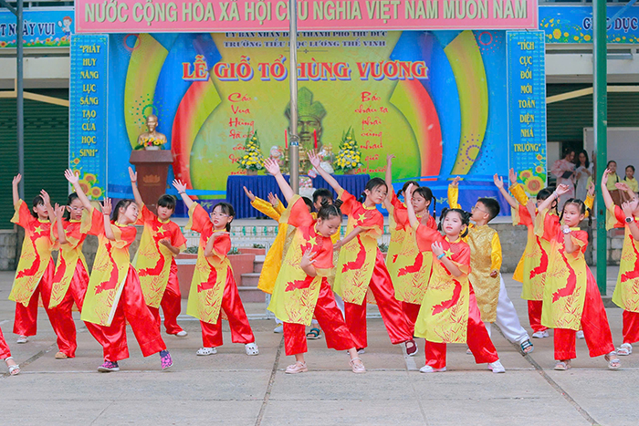 Tại Trường Tiểu học Lương Thế Vinh (TP.Thủ Đức), các hoạt động giáo dục học sinh tìm hiểu lịch sử, hướng về nguồn cội năm nay được nhà trường triển khai sinh động, mang nhiều màu sắc. Đại diện học sinh các lớp được dâng hương lên bàn thờ Tổ; các tiết mục văn nghệ do học sinh biểu diễn giúp không khí ngày Giỗ tổ thêm thiêng liêng, trang trọng. Cô Thu Hiền (giáo viên chủ nhiệm lớp 3/5 của trường) cho hay, ngày Giỗ tổ Hùng Vương năm nay, bên cạnh những hoạt động do nhà trường tổ chức thì trong lớp giáo viên cũng tổ chức thêm những hoạt động để giáo dục học sinh hiểu biết thêm về lịch sử, nguồn cội, giáo dục lòng yêu nước… “Trong các giờ học, giáo viên tích hợp để chia sẻ đến học sinh những bài học về lịch sử, các em rất hào hứng, thích thú”, cô Hiền chia sẻ.