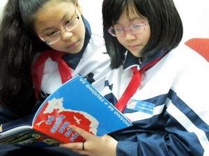 Các em học sinh Hà Nội hào hứng với cuốn sách ảnh về Trường Sa, Hoàng Sa. (Ảnh: Bích Ngọc/TTXVN)