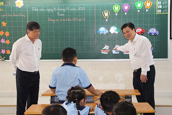 Thứ trưởng Bộ GD-ĐT Nguyễn Hữu Độ (ngoài cùng bên phải) và Phó Giám đốc Sở GD-ĐT TP.HCM Nguyễn Văn Hiếu dự giờ 1 tiết học lớp 1 tại Trường TH Phong Phú 2