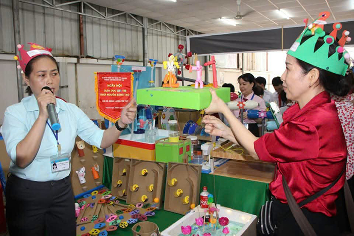 Với chủ đề Năng lượng tái tạo, các sản phẩm dạy học trong ngày hội đều được chế tạo từ vật liệu tái chế, gần gũi, thân thiện với môi trường, gắn với phát triển phẩm chất, năng lực học sinh.