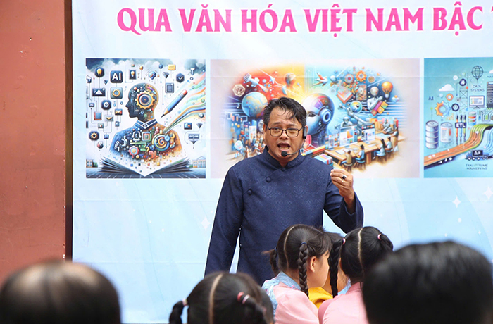 Thầy Nguyễn Trung Hiếu – giáo viên tiếng Anh – đã khéo léo dẫn dắt tiết dạy bằng nhiều hoạt động có ứng dụng công nghệ số, công nghệ AI đầy phong phú. Với bài học về chủ đề áo dài, song không đơn thuần chỉ là học từ vựng, học sinh còn được tham gia vào các trò chơi được tạo ra từ các ứng dụng AI, được cùng nhau sử dụng công cụ ChatGPT để thiết kế áo dài truyền thống theo ý tưởng của riêng mình. Đặc biệt, bằng các công cụ AI, thầy Hiếu đã dẫn dắt học sinh trong lớp đi tham quan bảo tàng áo dài 3D ngay tại lớp học, học sinh được học thông qua chính trải nghiệm thực tế.