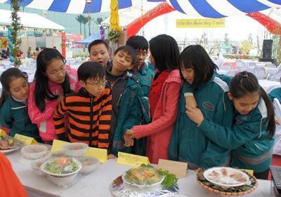 15 học sinh lớp 7A2 không chỉ được giao lưu, tham gia các hoạt động để thêm hiểu, thêm yêu các loài động vật, các em còn được đi tham quan các gian hàng chay với các thực phẩm thật quen mà lạ. Nào giò chay, cà phê chay, súp chay, cháo chay, bún miến chay, bánh gato chay… Lần lượt, các em được đi thăm các gian hàng của ba miền Bắc – Trung – Nam. Qua lời giải thích tận tình của các đầu bếp nấu đồ ăn chay, các em hiểu thêm về xuất xứ, cách làm và dinh dưỡng trong đồ chay. Ví như: cà phê chay là cà phê không sao với mỡ gà hay bất kỳ loại mỡ động vật nào do vậy không đậm bằng cà phê thường. Tuy nhiên, dùng cà phê chay là bảo vệ môi trường (một lượng gà lớn không bị giết thịt để lấy mỡ, khi uống xong cà phê thì chỉ cần tráng cốc bằng nước thường mà không phải dùng nước rửa bát…). Hay rượu chay, bia chay là những đồ uống lên men bằng hoa quả, hoàn toàn không có cồn, chất kích thích khiến con người không tỉnh táo và bị nghiện. Đặc biệt, các em được thưởng thức những món ăn bắt mắt về hình thức, hấp dẫn vị giác và thực sự ngon miệng. Nhiều em đã không thể quên ấn tượng khi nếm thử những món ăn vô cùng ngon miệng, hấp dẫn như món cá chiên dai mềm ngon ngọt, món tôm chiên ròn rụm, món thịt xiên nướng thơm lừng… mà nguồn gốc đều từ các loại bột và rau củ.