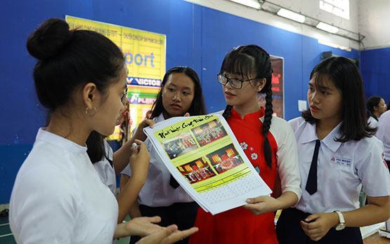“Góp” những bài hát dân ca cho dự án, em Nguyễn Hoàng Quân (lớp 10A9) chia sẻ, mỗi bài dân ca ngoài việc đại diện văn hóa vùng miền còn là những câu chuyện lịch sử. Thông qua âm nhạc, dự án đã trao cơ hội để mỗi học sinh tiếp cận với những câu chuyện đó một cách nhẹ nhàng. Trong khi đó, em Đặng Tùng Chi (lớp 11A1) lại sử dụng CNTT để thiết kế các sản phẩm truyền thống. Với Tùng Chi, khó nhất là làm sao sử dụng công nghệ hiện đại mà vẫn giữ được hồn truyền thống. “Tái hiện tranh dân gian quan trọng nhất là màu sắc. Cách phối màu trên máy tính phải đảm bảo giữ được không gian xưa. Dự án đã trang bị cho chúng em nhiều kiến thức về các dòng tranh dân gian Việt, các nét văn hóa xưa. Đồng thời, cũng rèn thêm cho chúng em nhiều kỹ năng về thuyết trình, ứng dụng CNTT”, Tùng Chi nói. Còn với mô hình chợ Bến Thành, Lê Quý Di Luân (lớp 11A13) cho biết nhóm phải thực hiện 2 chuyến đi “mục sở thị” ngôi chợ nổi tiếng này để có cái nhìn toàn diện, chi tiết nhất. Chợ Bến Thành là nét đặc trưng của TP.HCM, từ vòm chợ, đến cổng chợ phía Đông, phía Tây đều có những nét riêng biệt, độc đáo. Do vậy, để thể hiện đúng linh hồn của chợ, các chi tiết đó phải được làm càng rõ càng tốt. “Gắn với thông điệp bảo vệ môi trường và văn hóa truyền thống, nhóm mất 1 buổi thu gom rác thải như ống hút nhựa, bìa hồ sơ… ở trường, chỗ tập kết ve chai. Điều khó nhất khi xây dựng mô hình là làm sao tận dụng được hết các nguyên liệu tái chế một cách tự nhiên”, Di Luân cho biết.