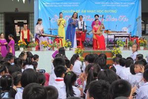 Trường TH Trương Quyền (Q.3, TP.HCM) vừa phối hợp với CLB Tiếng hát quê hương tổ chức buổi giới thiệu nhạc cụ dân tộc đến giáo viên và học sinh trong trường. Tại đây, các giáo viên và học sinh tỏ ra thích thú trước những âm thanh khác nhau của nhiều loại nhạc cụ như: Đàn tranh, đàn tì bà, sáo, trống, song loan…, bởi trước giờ thầy và trò chỉ dạy – học âm nhạc dân tộc dựa trên lý thuyết là chính. Cô Phan Thị Yến, Hiệu trưởng nhà trường, chia sẻ: “Có hơn 10 loại nhạc cụ dân tộc được các nghệ sĩ trong CLB biểu diễn, giới thiệu đến giáo viên và học sinh. Được trực tiếp xem các tiết mục biểu diễn, các em sẽ nắm rõ và hiểu kỹ hơn về vai trò của các loại nhạc cụ, qua đó khơi gợi tình yêu âm nhạc dân tộc trong tâm hồn các em”.