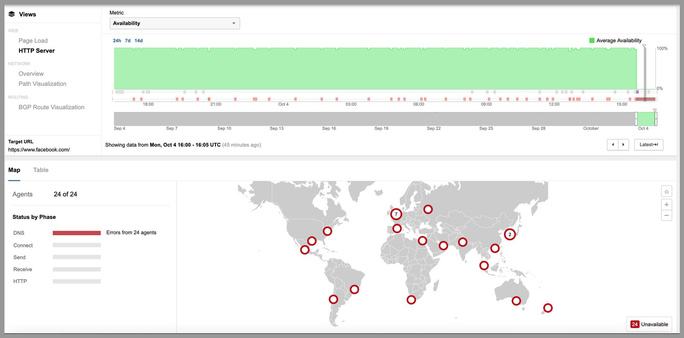 Bản đồ cho thấy kết nối đến Facebook bị gián đoạn vào ngày 4-10. Về cơ bản kết nối bị gián đoạn ở mọi nơi, cùng lúc. Ảnh: Cisco