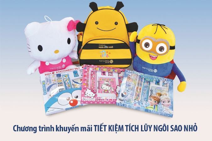 Từ ngày 22/06 đến 20/09/2016, Ngân hàng TMCP Bản Việt (Viet Capital Bank) triển khai chương trình khuyến mại “Vui cùng Ngôi Sao Nhỏ”. Theo đó, khách hàng chỉ cần mở mới hoặc nộp thêm tiền vào tài khoản tiết kiệm tích lũy “Ngôi sao nhỏ” từ 10 triệu đồng trở lên tại Ngân hàng, khách hàng sẽ được nhận những phần quà xinh xắn, hữu ích dành cho bé yêu như: Bộ dụng cụ học tập (Doraemon, Elsa, Kitty), thú bông Minion, thú bông Hello Kitty, ba-lô hình con ong.