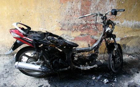 Theo quan sát của chúng tôi, chiếc xe Yamaha Nouvo màu đỏ BKS 29T4-9331 bị thiêu rụi gần như hoàn toàn, chỉ còn phần đuôi và bánh sau sót lại.