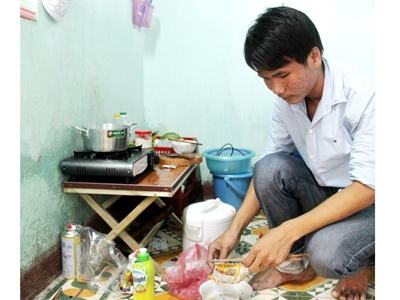 | Hiền tằn tiện từng bữa ăn để tiết kiệm tiền mua sách vở. Ảnh: Nguyễn Huy. |