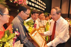 Ông Nguyễn Thiện Nhân – Chủ tịch UBMTTQ Việt Nam tặng bằng khen cho các đơn vị, cá nhân xuất sắc trong việc thực hiện Cuộc vận động người Việt Nam dùng hàng Việt Nam. Ảnh: Q.Huy
