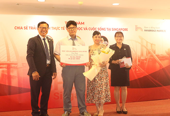 Dịp này, Học viện Hanbridge đã trao tặng học bổng S$1,500 cho tân sinh viên Nguyễn Hữu Hoàng (cựu học sinh Trường THPT Hùng Vương, TP.HCM). Hoàng đã có bài tự luận đầu vào chương trình FCBI (Dự bị đại học nền tảng về đổi mới sáng tạo trong kinh doanh) thể hiện động lực rất chân thành và đưa ra những lý do cá nhân rõ ràng khi đăng ký khoá học. Bài tự luận cũng thể hiện được sự nhận thức về cả nhu cầu phát triển học thuật và cá nhân.