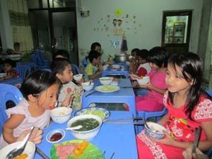Bữa cơm trưa của các em mắc bệnh xương thủy tinh tại Trung tâm Kim Cương
