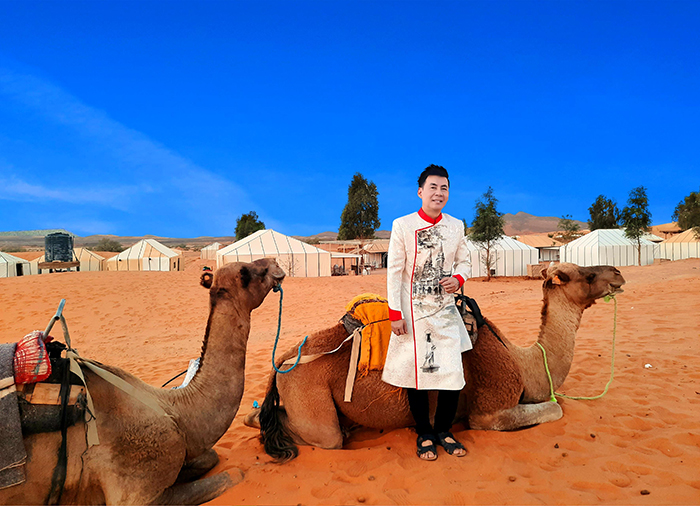 Đoan Trường và chiếc áo dài có vẽ biểu tượng Nhà thờ Đức Bà Việt Nam trên sa mạc Sahara ở Ma Rốc