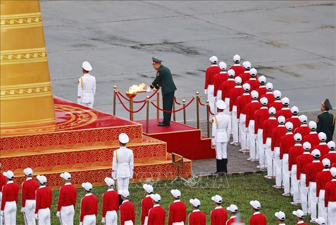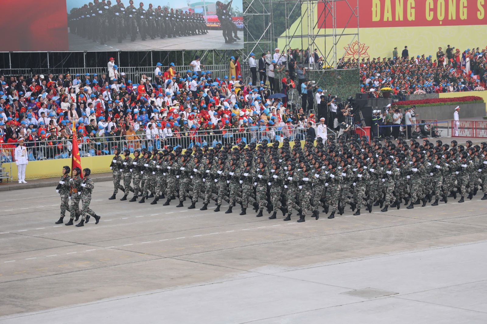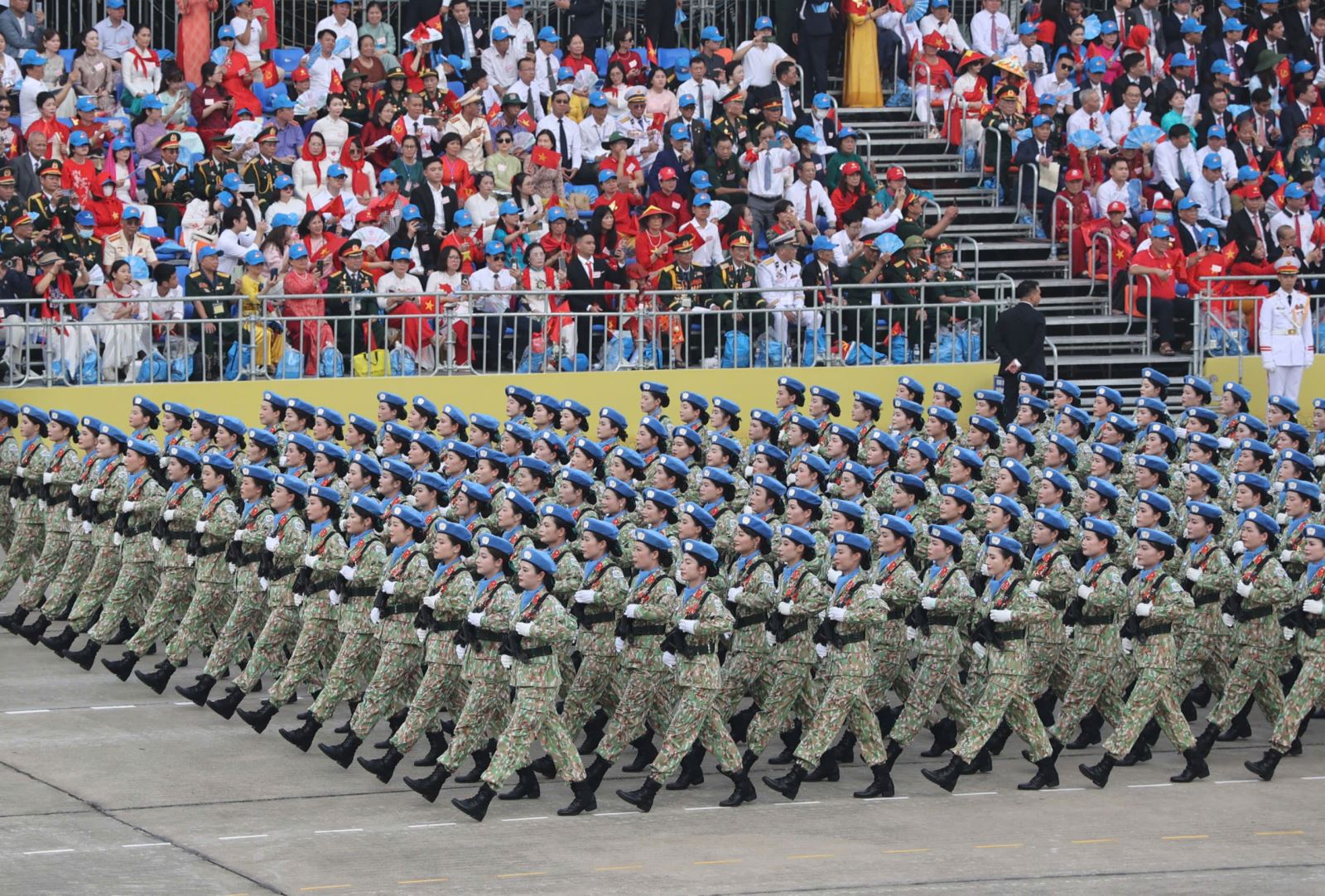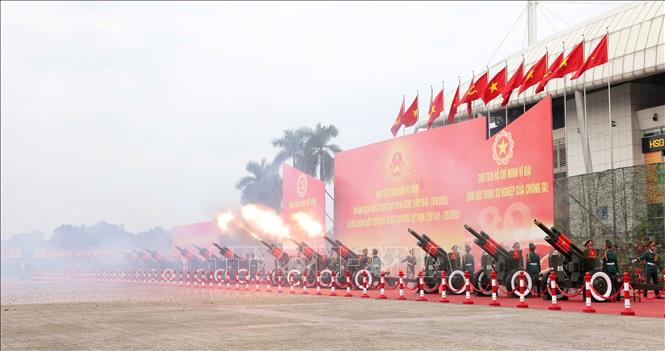 Lễ “Rước đuốc truyền thống”. Ảnh: Doãn Tấn/TTXVNNgọn lửa được trao cho Trung tướng, Anh hùng lực lượng vũ trang nhân dân Nguyễn Đức Soát, nguyên Phó tổng Tham mưu trưởng Quân đội nhân dân Việt Nam, người đã có thành tích đặc biệt xuất sắc, bắn rơi 6 máy bay của địch, trở thành một trong những phi công anh hùng của Quân đội nhân dân Việt Nam. Ảnh: Doãn Tấn/TTXVNLúc 6 giờ 45: 15 khẩu đại bác đồng loạt khai hỏa, mở màn Lễ kỷ niệm diễu binh, diễu hành 80 năm Quốc khánhBiên đội máy bay trực thăng Mi-171, Mi-17, Mi-8 mang theo cờ Đảng, cờ Tổ quốc bay qua khu vực Quảng trường Ba Đình. Ảnh: Lâm Khánh/TTXVNXe mô hình Quốc huy nước Cộng hòa xã hội chủ nghĩa Việt Nam đi đầu khối diễu binh, diễu hành. Ảnh: TTXVNKhối nữ Quân nhạc. Ảnh: Phương Hoa/TTXVCác khối Quân đội diễu hành trên Quảng trường Ba Đình. Ảnh: Doãn Tấn/TTXVNKhối nữ sĩ quan Quân y. Ảnh: Lâm Khánh/TTXVNKhối sĩ quan Biên phòng. Ảnh: Lâm Khánh/TTXVNKhối nữ chiến sĩ Biệt động. Ảnh: Lâm Khánh/TTXVNKhối chiến sĩ Công binh. Ảnh: Lâm Khánh/TTXVN