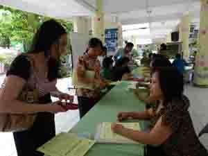 Phụ huynh nộp hồ sơ vào lớp 1 diện trái tuyến tại Trường Tiểu học Nguyễn Bỉnh Khiêm, Q.1 (ảnh chụp năm 2012)