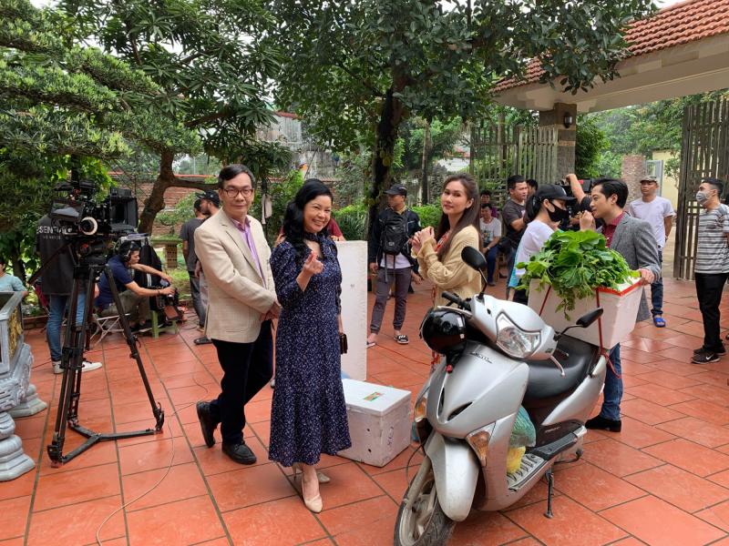 Ê-kíp thực hiện Mùa hoa tìm lại đang quay cảnh vợ chồng Tuyết đến nịnh nọt để được thăng chức