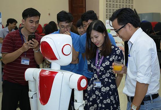 | Đại biểu, sinh viên tìm hiểu về sản phẩm công nghệ phục vụ đào tạo trực tuyến tại Trường ĐH Sư phạm Kỹ thuật TP.HCM ngày 17-4 |
