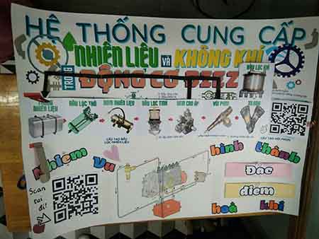 Đây là sáng kiến của cô Lê Thị Thúy (giáo viên môn công nghệ Trường THPT Lê Quý Đôn, Q.3, TP.HCM) khi cho học sinh vẽ sơ đồ từ khổ giấy A0 trong môn công nghệ. Theo đó, học sinh chia thành nhóm (mỗi nhóm từ 2-4 em) vẽ sơ đồ từ chương trình “Động cơ đốt trong” của môn công nghệ lớp 11. Trong sơ đồ, các em không viết nhiều nội dung bài học mà chỉ thể hiện lại bằng hình ảnh. Không chỉ có hình ảnh liên quan nội dung trong chương trình học, các em còn mở rộng từ kiến thức thực tế. Đặc biệt, các em nhấn mạnh vào kiến thức về cơ cấu trượt, xoay, các mô hình và mã QR. Cô Thúy cho biết trong nhóm, mỗi em đảm nhận 1 phần nội dung bài học để thực hiện sơ đồ. Những em phụ trách ít nội dung sẽ kiêm thêm vai trò làm MC hoặc hướng dẫn các bạn tham gia phần trò chơi củng cố kiến thức sau chương trình học. “Hệ thống hóa kiến thức thông qua hình ảnh, mô hình như thế này giúp các em nắm kỹ bài, dễ nhớ, dễ thuộc. Bên cạnh đó, thông qua sơ đồ, các em còn có thể phát triển nhiều kỹ năng trong việc giải quyết vấn đề; kỹ năng thuyết trình; nghiên cứu chuyên sâu… Từ đó, các em sẽ cảm thấy tự tin hơn trong thuyết trình, truyền đạt lại nội dung mình đã thu thập được cho người nghe dễ hiểu. Với cách học này, học sinh rất hào hứng và thích thú, không còn cảm thấy môn công nghệ khô khan, khó học”, cô Thúy nhấn mạnh.